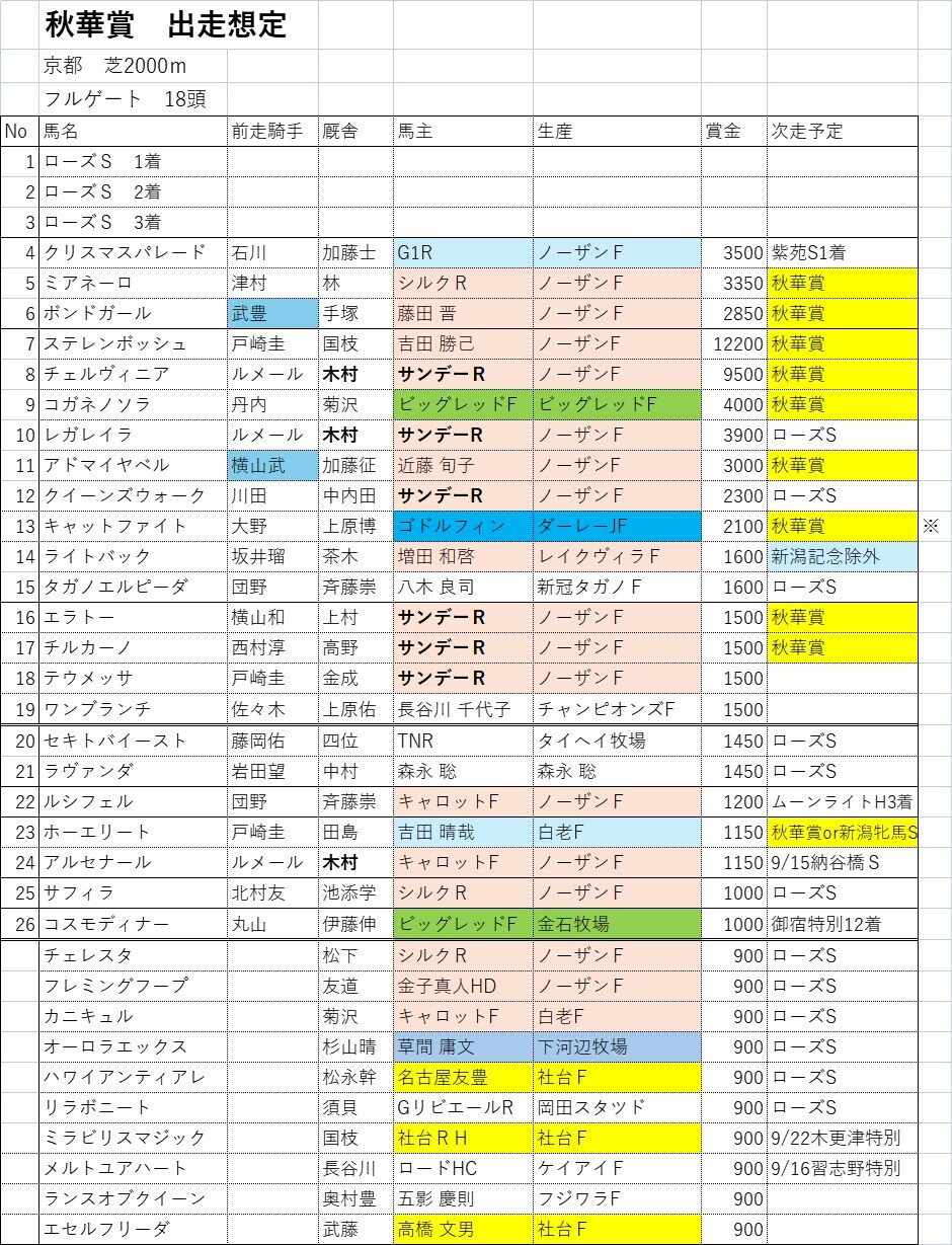 ※キャットファイトが秋華賞に参戦の模様。すみません、追加しました。