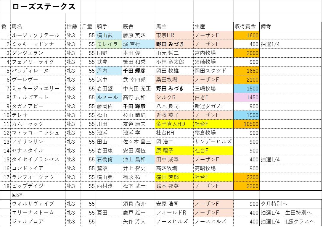 それどころか、このローズSに出走することすら、特別登録段階ではピンチでした。その段階では400万円同士で1/4抽選の状況。