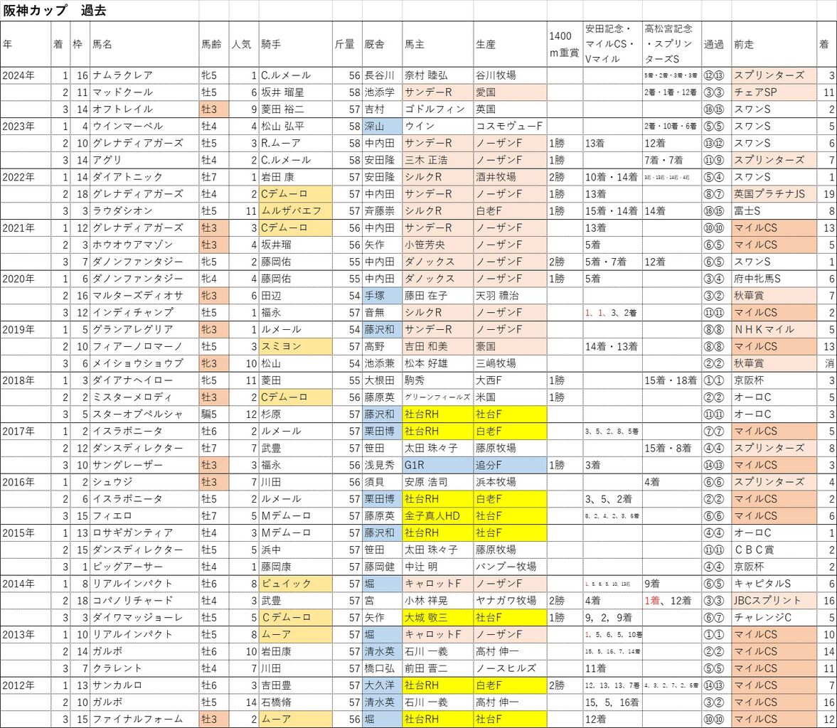 昨年の阪神Cも京都牝馬S(芝1400m)で2着だったナムラクレアが1着。3着にもスワンS(芝1400m)2着だったオフトレイルが2着。